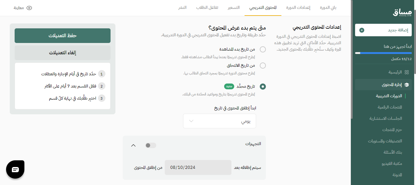 - تاريخ محدَّد: يُطرح المحتوى تدريجيًا بتاريخ ومواعيد مُحدّدة من قبلك